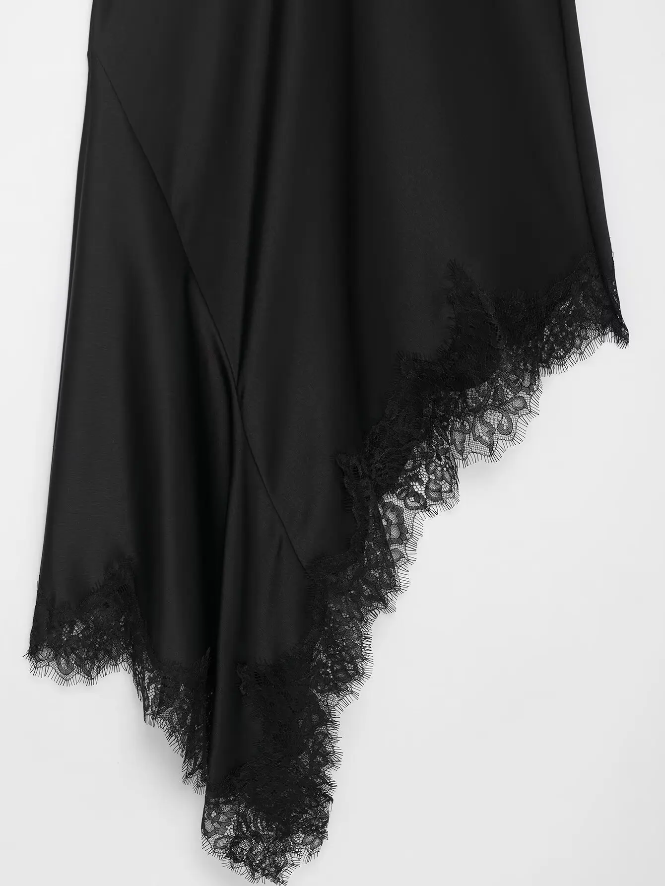 BSAY 2025 Summer New Product Women's Lace Decorative Satin Texture Strap Sexy Dress with Hanging Neck and Asymmetric Bottom